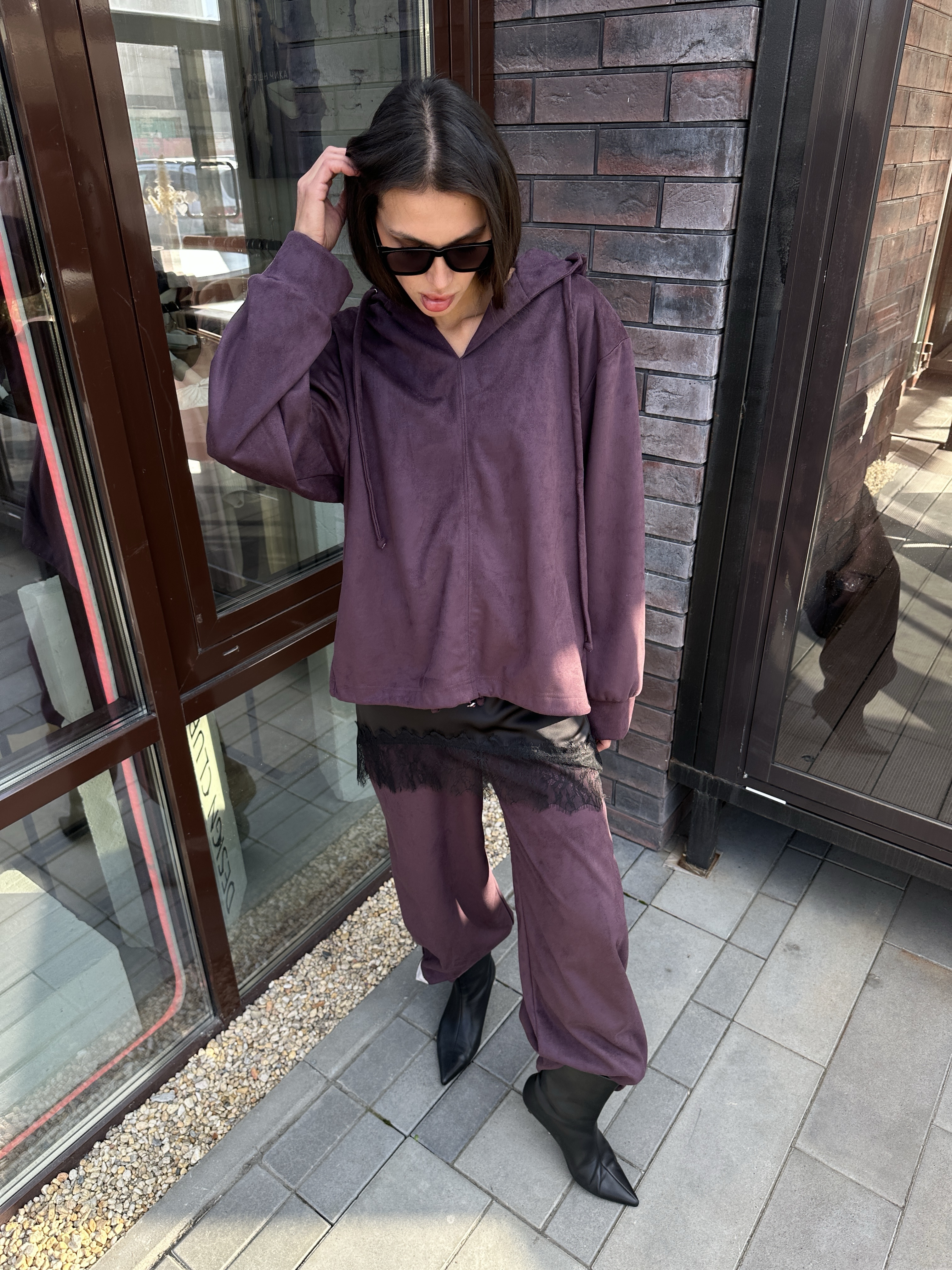 Анорак оверсайз-силуэта из эко-замши с внутренней стороной из вискозы. Внизу изделия функциональная кулиска, которая позволяет регулировать длину. На спине фирменная нашивка из хлопка. На капюшоне длинный шнурок из основной ткани.