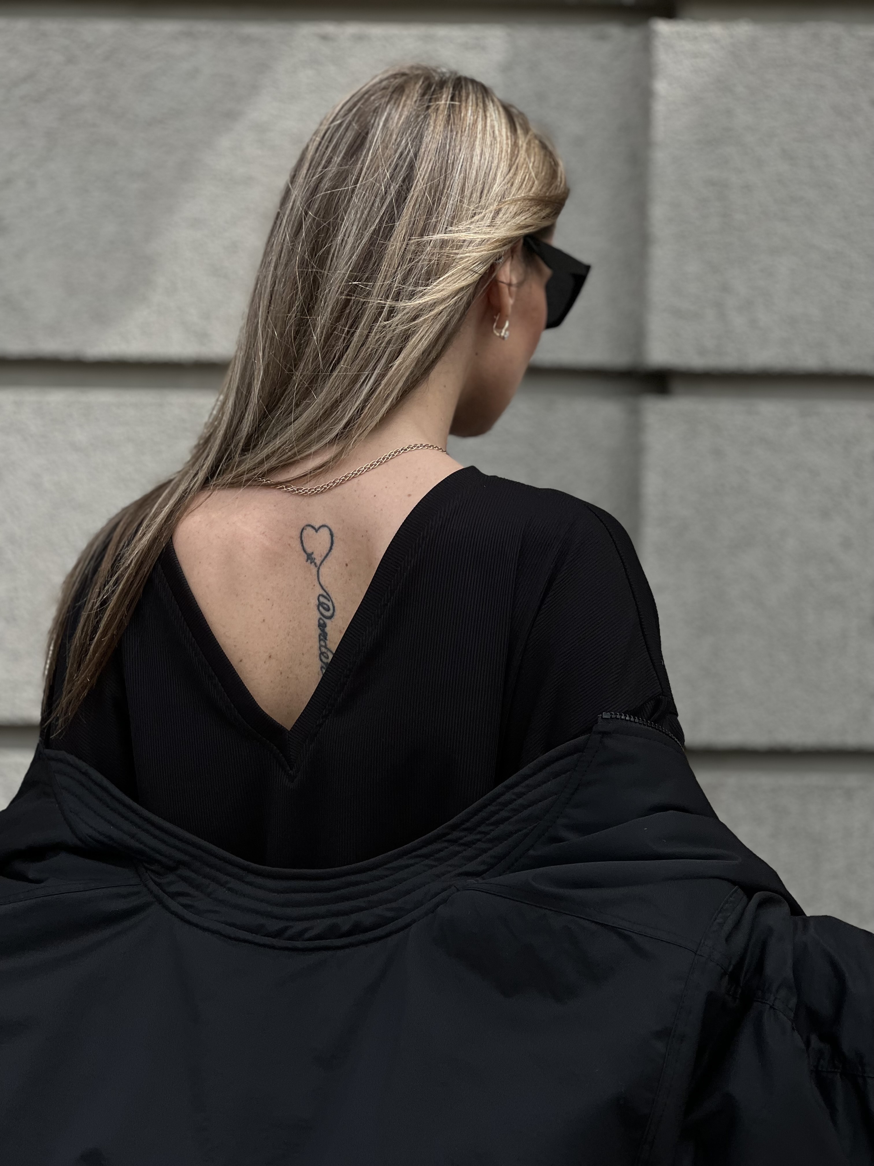 Базовая модель из вискозной лапши подойдет как часть повседневного гардероба или дополнение к деловому образу. Деликатный V-образный вырез на спине.