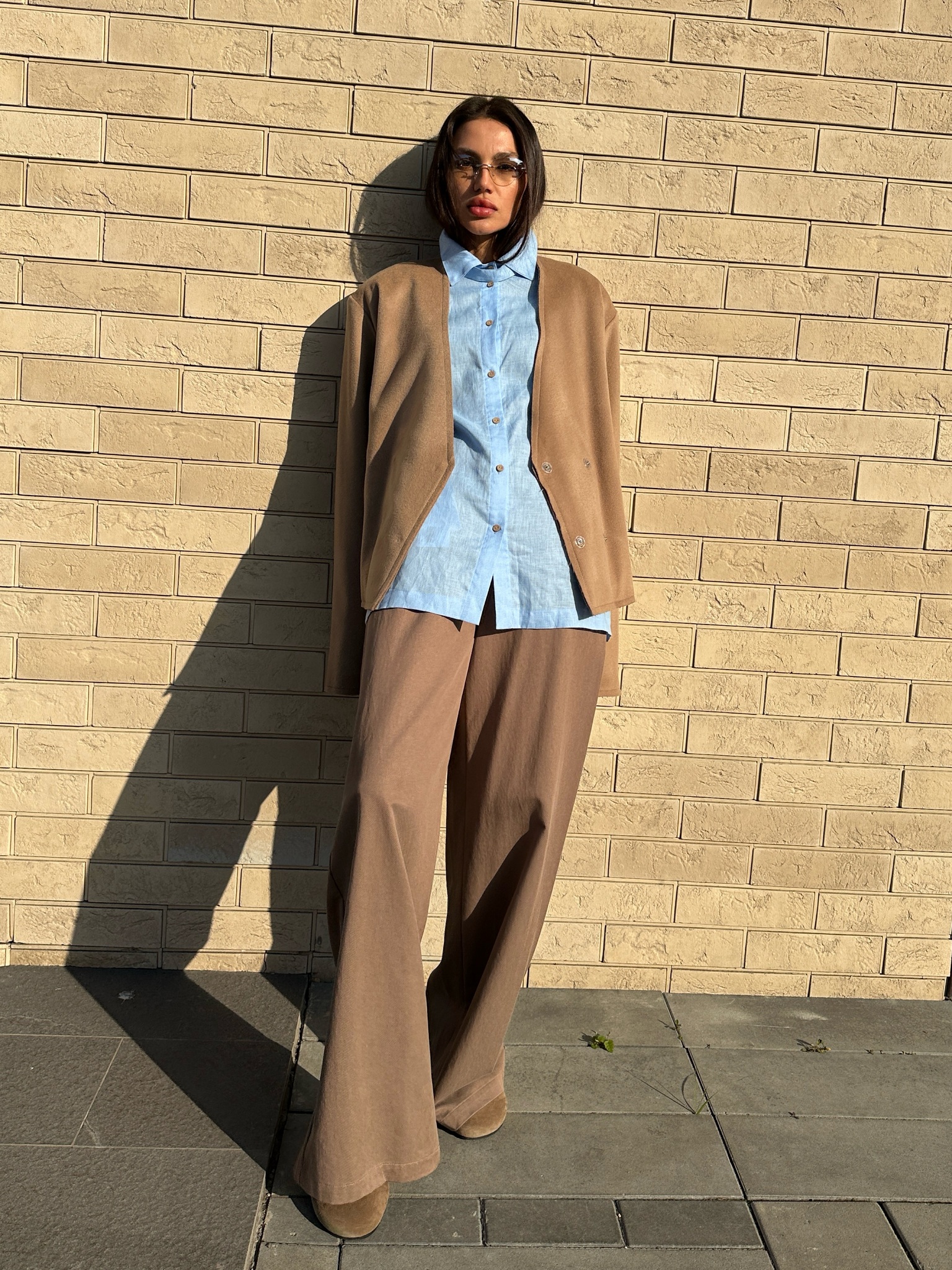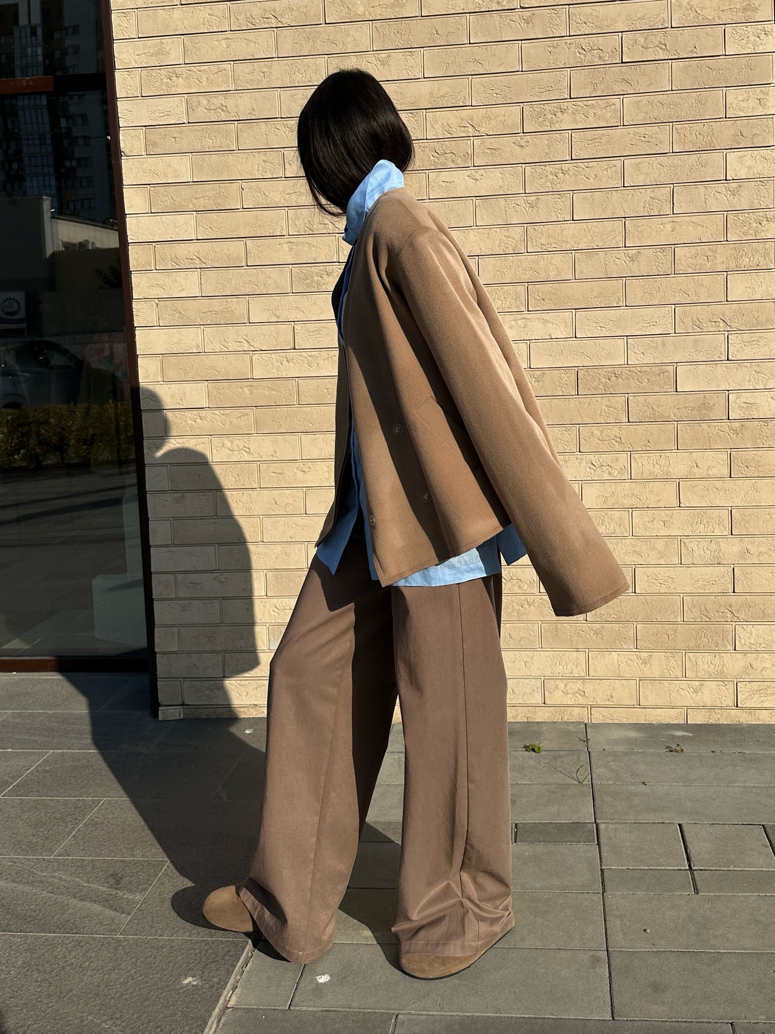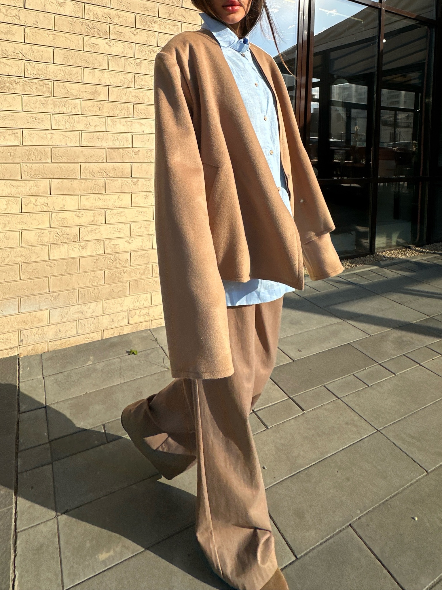 Пальто-жакет из 100% Итальянской премиум шерсти, прямого кроя и минималистичного фасона без лацканов. Жакет представлен в едином размере оверсайз. Изделие имеет прорезные карманы, двубортную застежку на кнопках. Открытые срезы по краям изделия и акцентной отстрочкой. На рукавах широкая подгибка , что позволяет регулировать его длину.