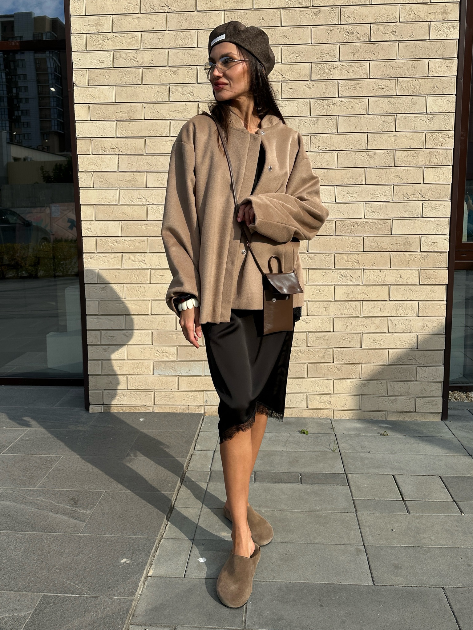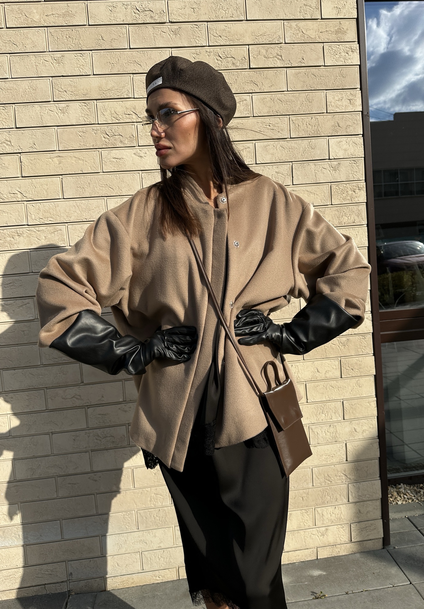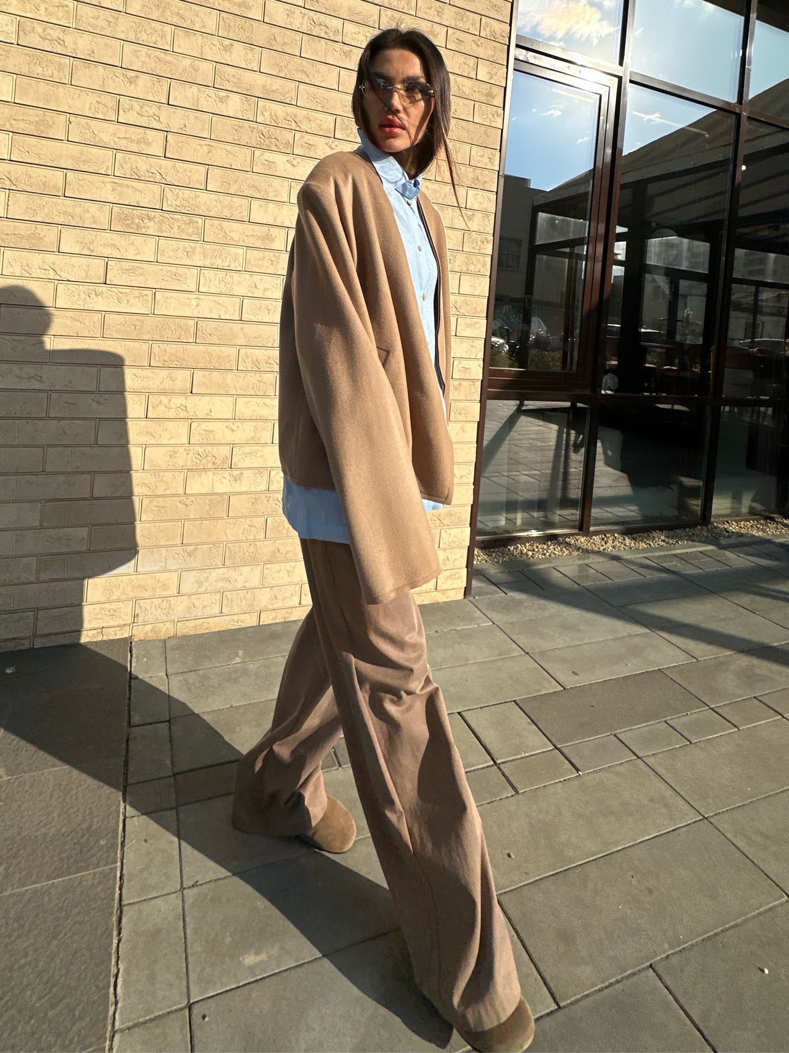 Пальто-жакет из 100% Итальянской премиум шерсти, прямого кроя и минималистичного фасона без лацканов. Жакет представлен в едином размере оверсайз. Изделие имеет прорезные карманы, двубортную застежку на кнопках. Открытые срезы по краям изделия и акцентной отстрочкой. На рукавах широкая подгибка , что позволяет регулировать его длину.