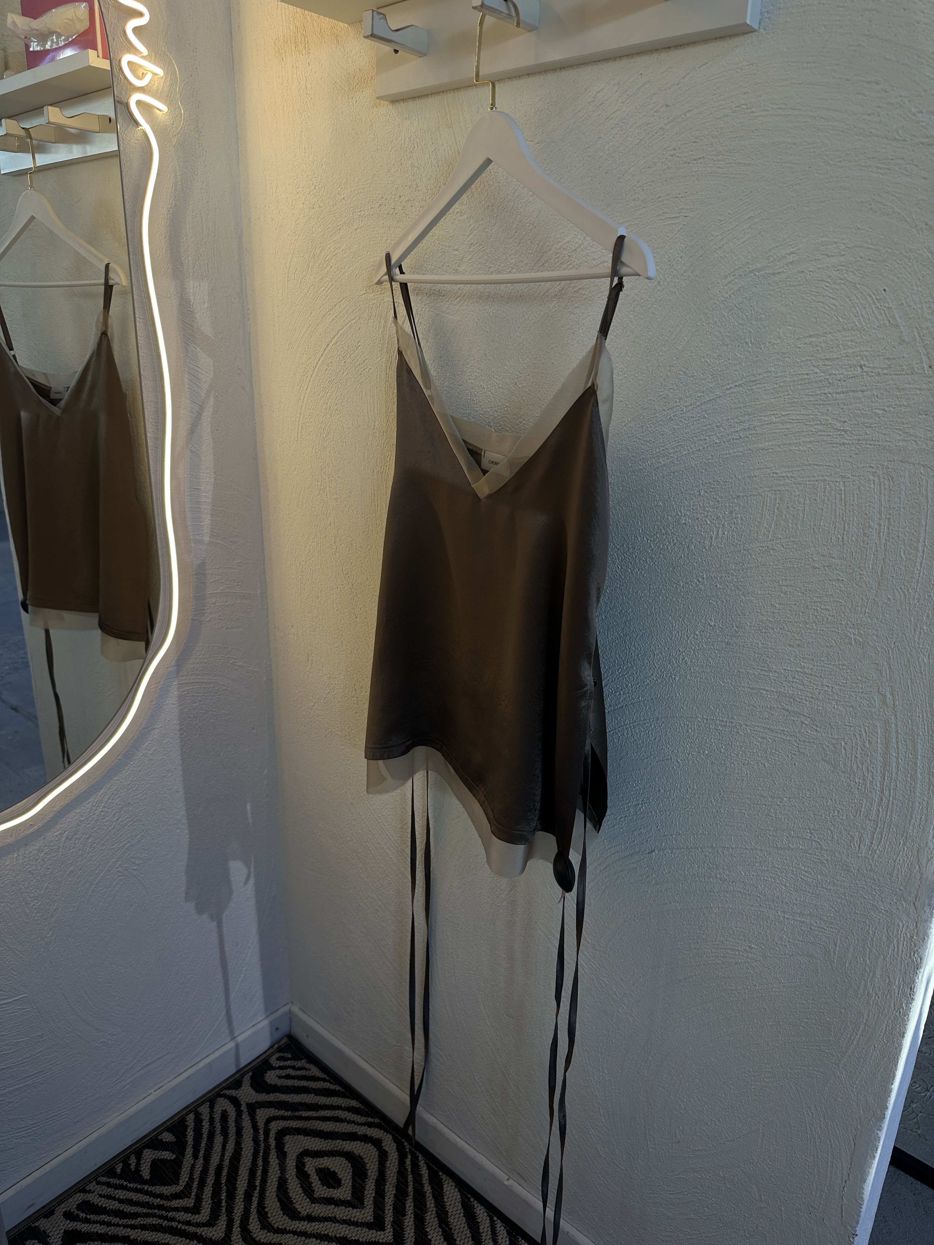 Топ в бельевом стиле из шелковистого фактурного ацетата. Акцентные разрезы по бокам и длинные завязки. Отделка из нежной органзы с шелком.