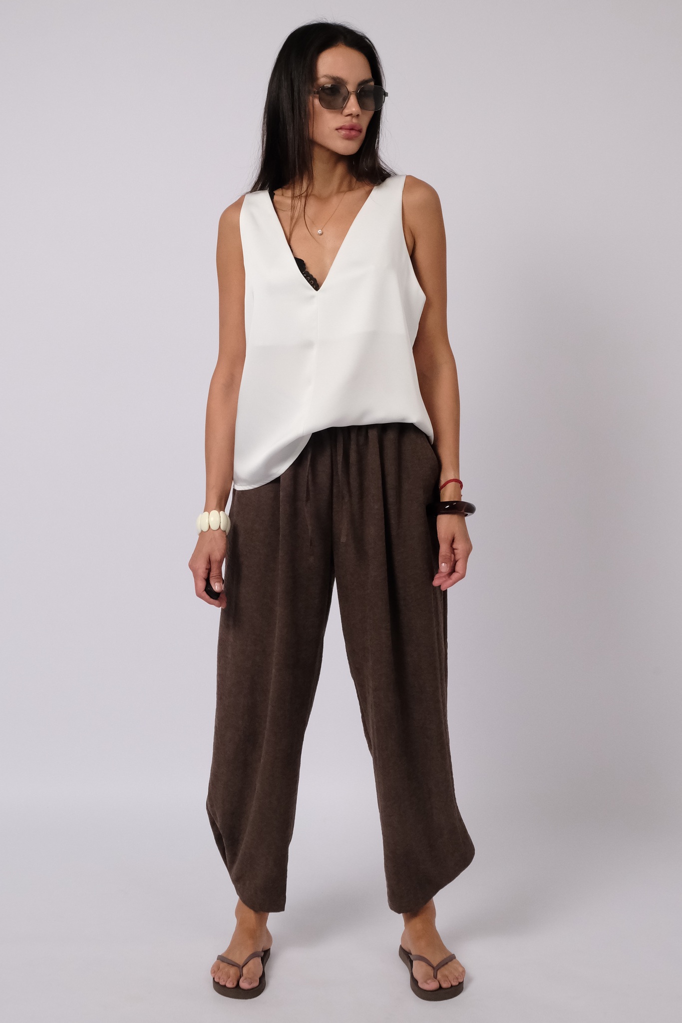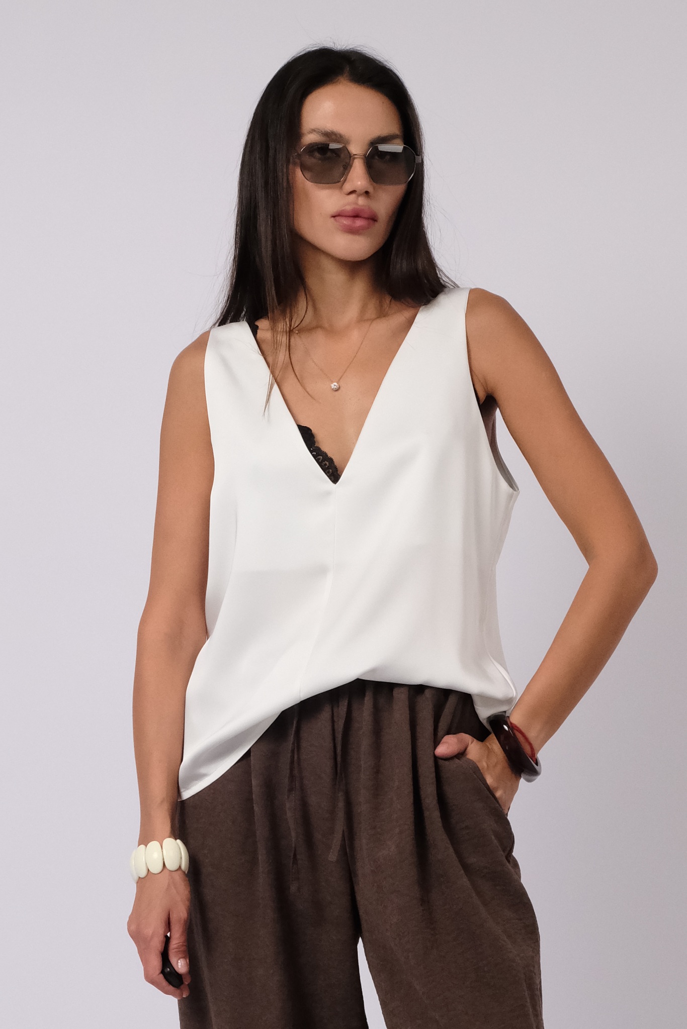 Топ из японского шелка с V - вырезом спереди и на спинке. Двойной верх топа позволяет его носить без белья. Топ является базой для ваших многослойных образов.